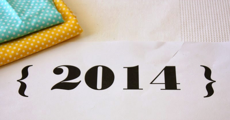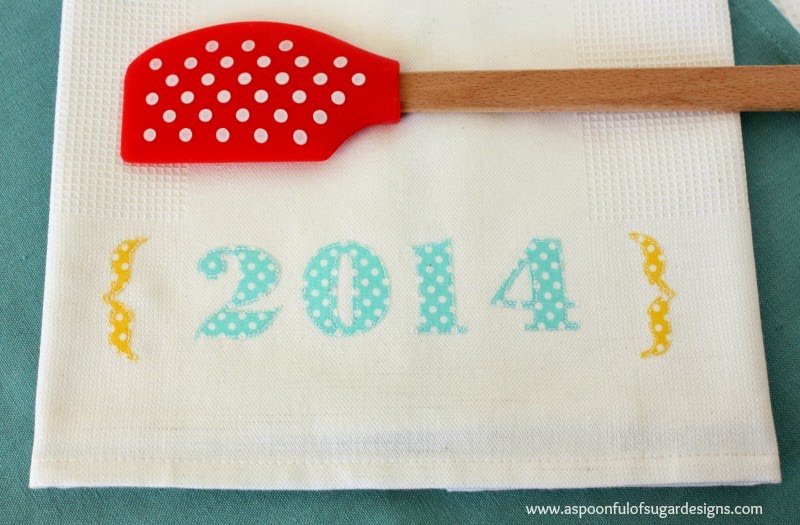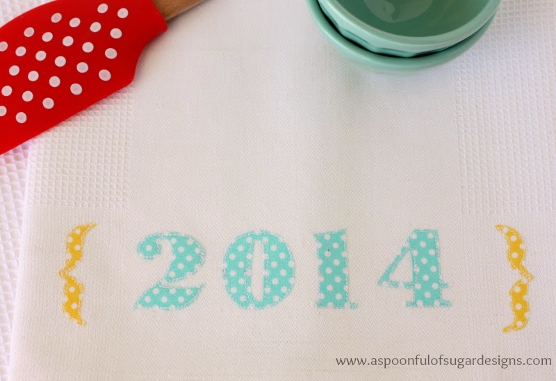 Using Word, I printed out {2014} in a font and size to suit. (I used Bodoni MT Black in size 160). I traced the characters in reverse onto the back on some double sided appliqué web (e.g. vliesofix or steam a seam). The numbers were then ironed onto the wrong side of colourful polka dot fabric, and cut out. The paper backing was peeled off and the numbers were placed in position on the tea towel, and fused in place with the iron. Lastly the numbers were sewn around twice to hold in place.