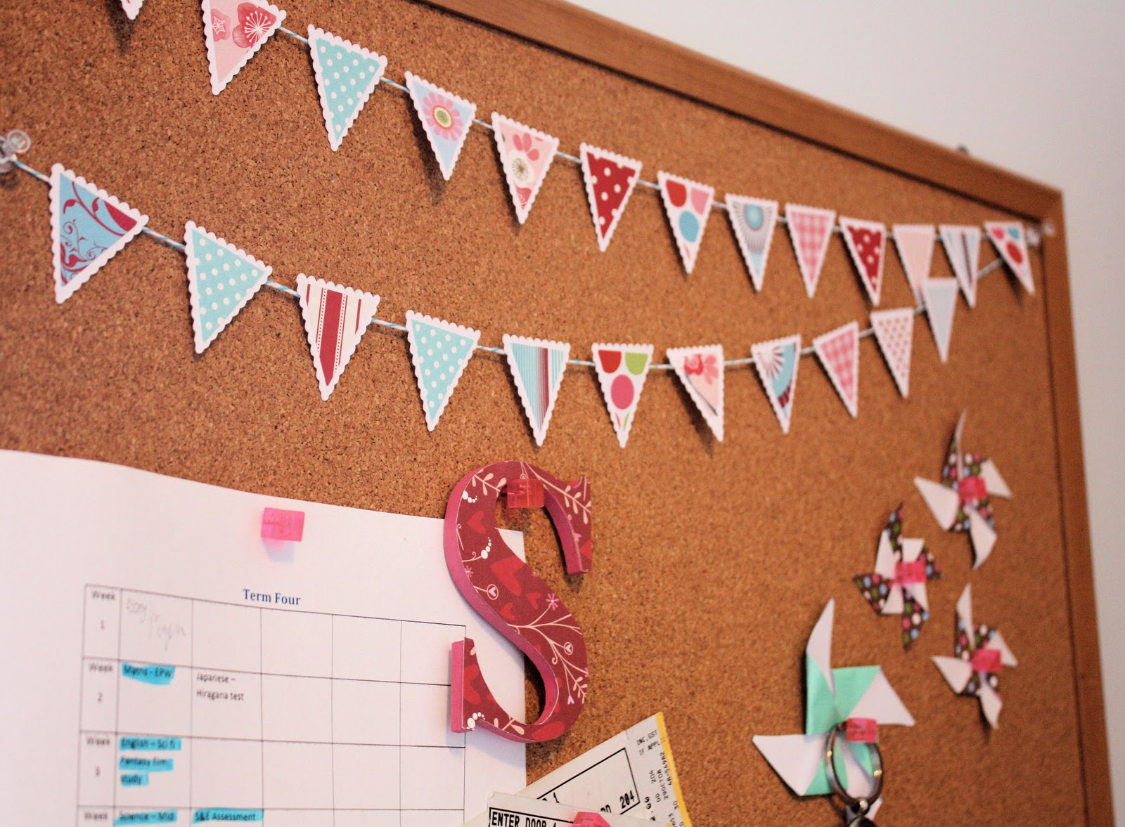 Here is the finished bunting for Sarah’s bulletin board. I just taped the divine twine to the back of the little flags instead of punching holes in them. Sarah was thrilled with it.