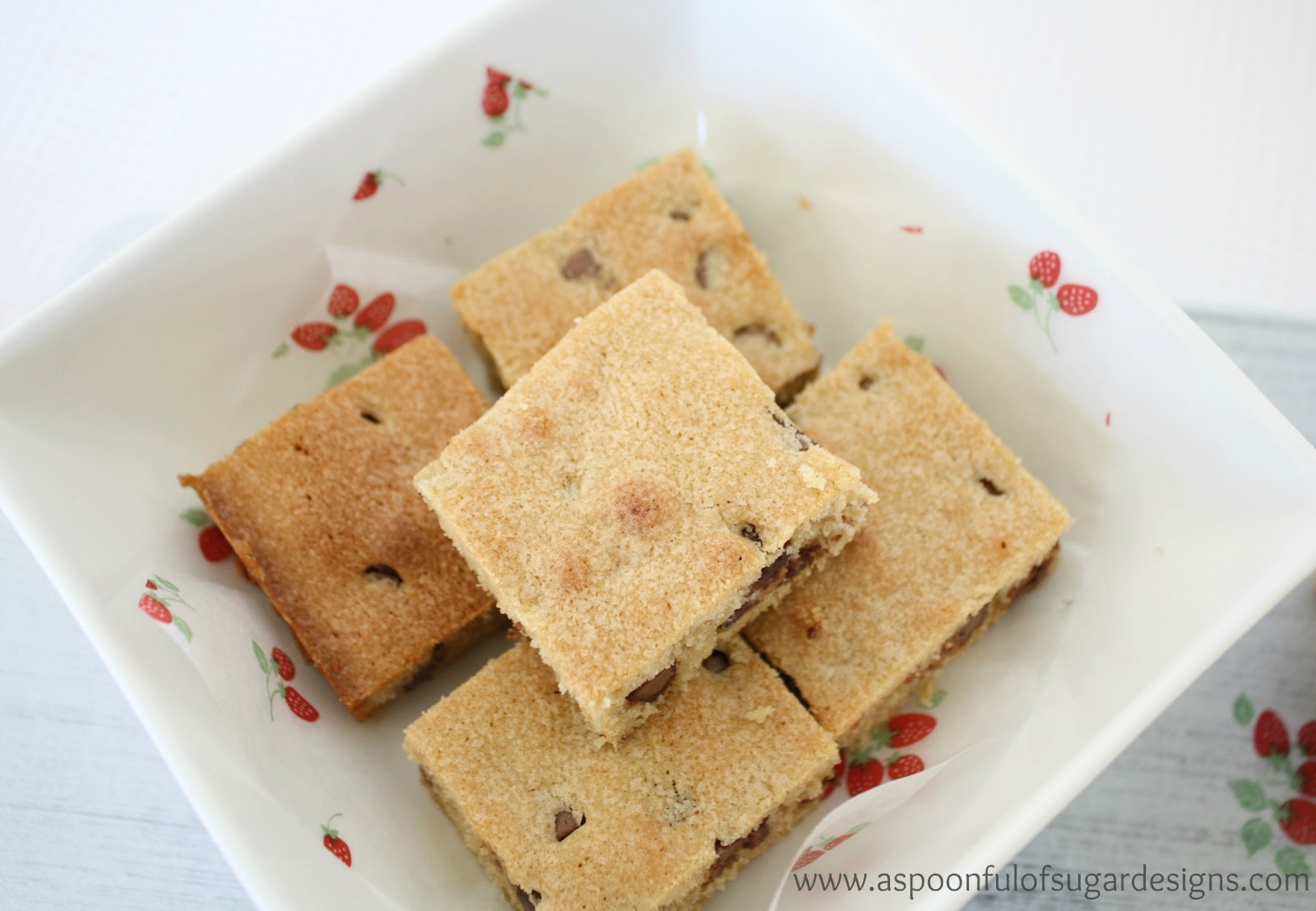 Preheat oven to 180 deg C (350 deg F). Line the base of a brownie pan measuring 18 x 28 cm (base) with baking paper. Use electric beaters to beat butter and sugars until light and creamy. Beat in eggs one at a time. Fold in the flour and mix until just combined. Stir in the chocolate chips. Spoon the mixture into the prepared pan. Bake for 25 minutes until firm to the touch. Cool on wire rack in pan. Cut into squares.
