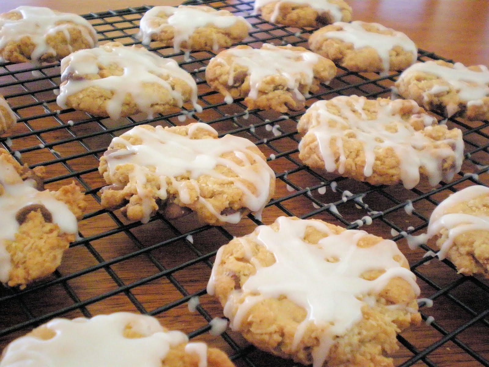 Remove from oven and cool. Stir water into the icing sugar to make a smooth paste. Drizzle icing across each cookie. Allow icing to set.