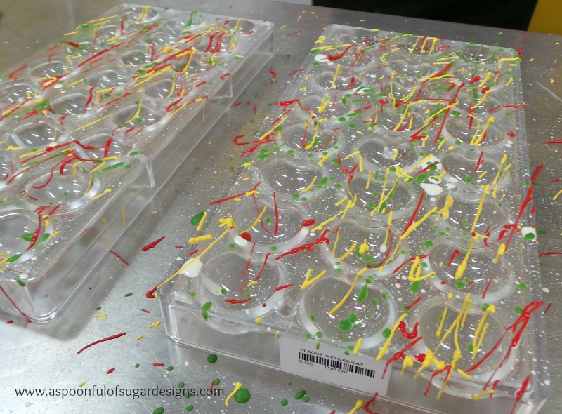 We used coloured milk chocolate to decorate our round moulds.