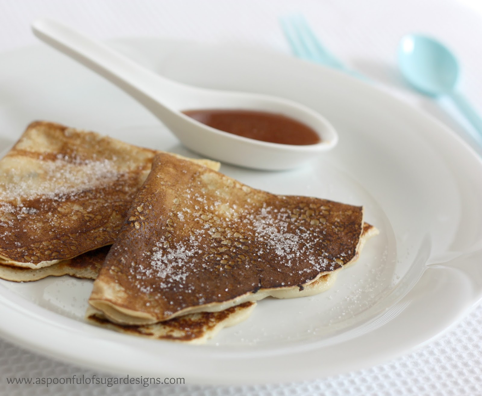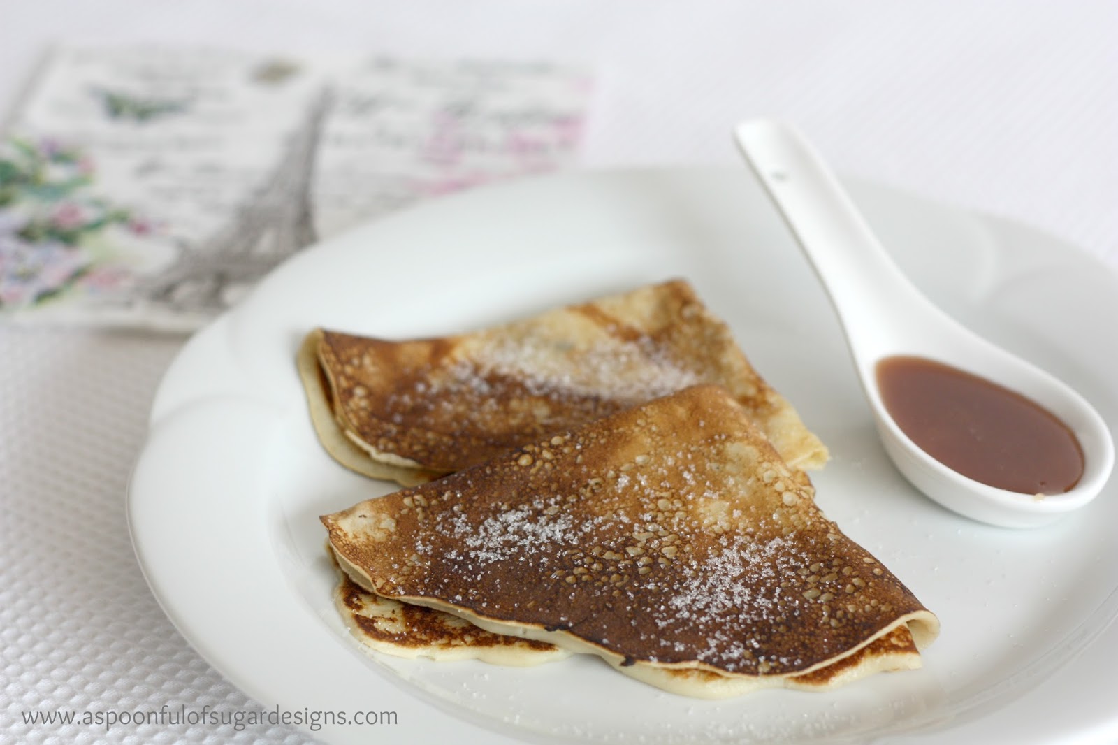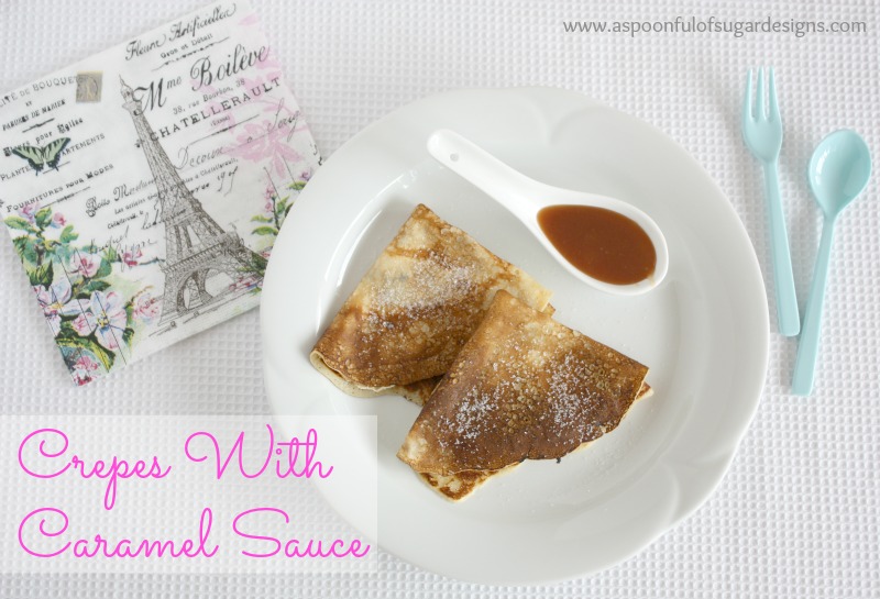 Sarah made the crepes using the crepe recipe from Laduree: Sucre The Recipes, which has so many authentic French recipes for sweet treats. She made a thick caramel sauce to go with them. We spread the crepes with caramel sauce, folded them into quarters, and topped them with some sugar. Amazing!