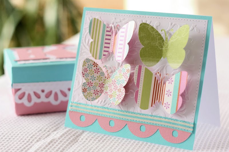 I always love seeing what you’re working on because you’re always making the cutest stuff! That card and gift box set is adorable – love the dimensional butterflies. I love the combination of the red thread and aqua check or gingham too. Such a great color combo!