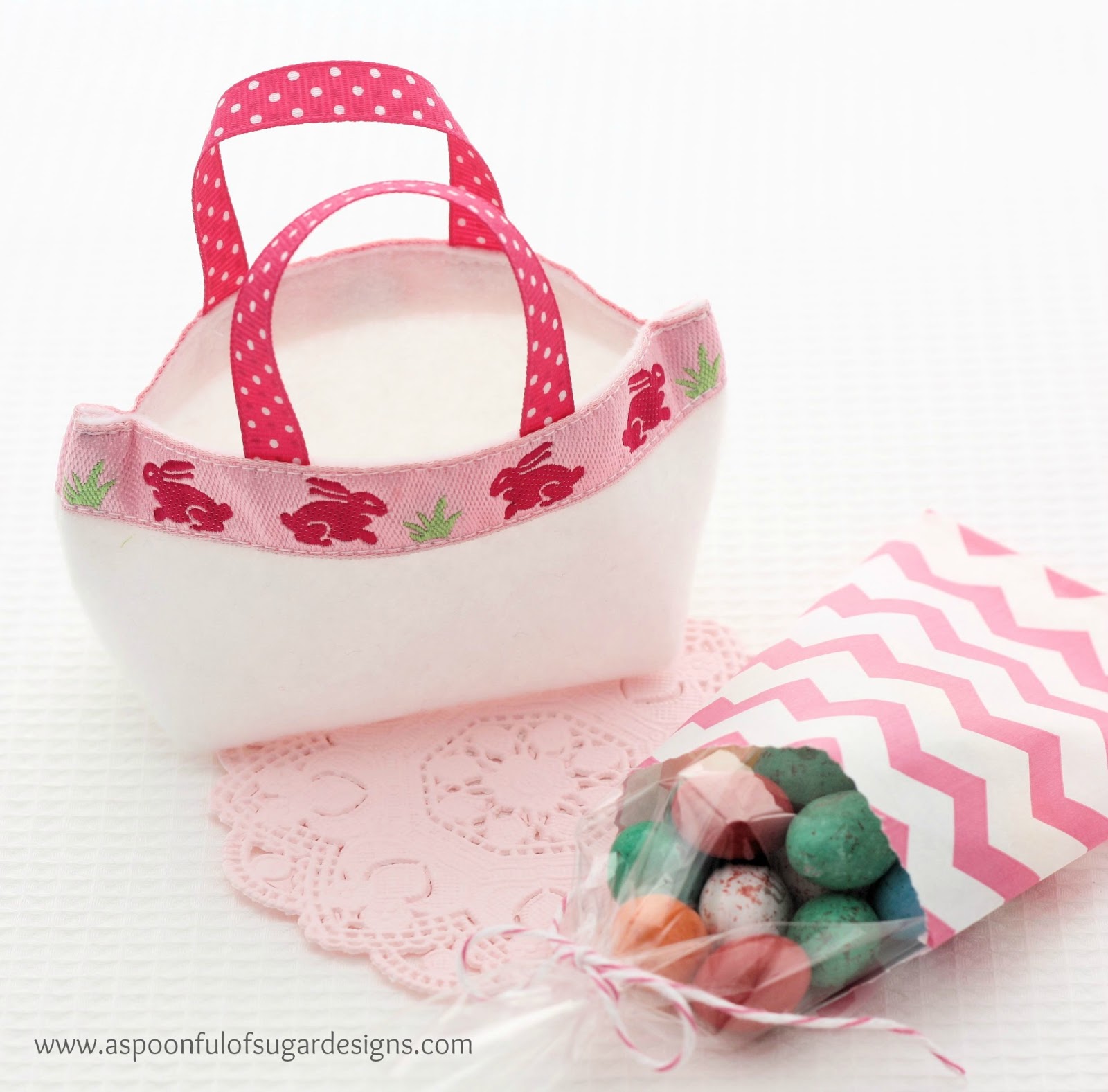 With Easter only 6 weeks away, we have been designing some Mini Easter Baskets to make using small pieces of felt and ribbon from our stash. We celebrate Easter in a fairly low key way. We usually have a lovely meal with our family and share some little Easter treats. We are always dreaming up new ways to gift a small package of chocolate eggs. We had some sweet Easter bunny ribbon in our stash so combined it with some felt to make little Easter Baskets.