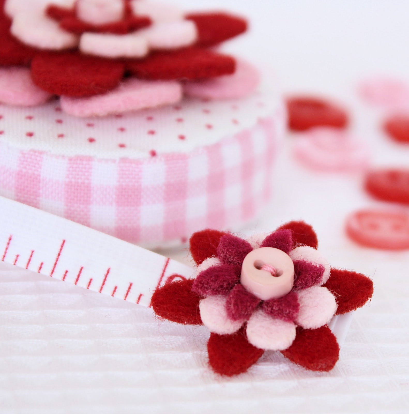 The Covered Tape Measure Tutorial was one of my first free tutorials. Although my photography and styling has improved enormously since it was published on our blog in 2008, the instructions are still the same. Simply stitch the layered felt flowers onto one side of the cover before it is assembled. Use double sided fusible web to attach applique (such as Steam a Seam light; Vliesofix; etc).