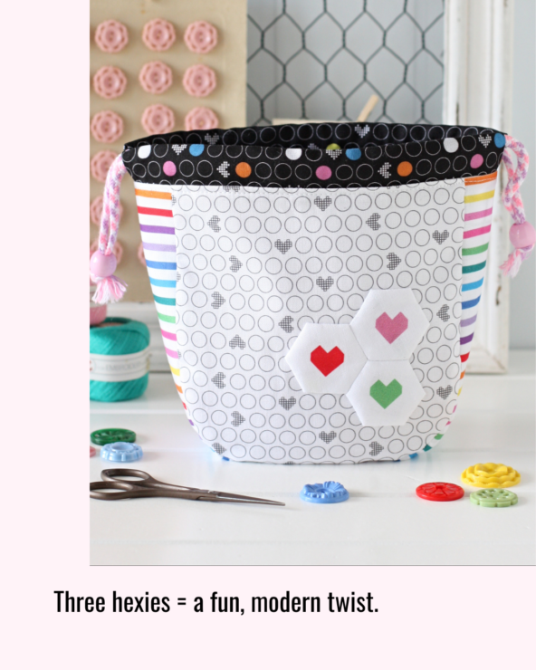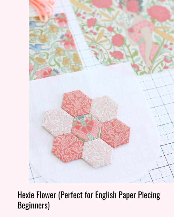 For a fresh, contemporary look, try adding three small hexies instead of a flower. This variation is playful, modern, and perfect for bold prints or fussy‑cut hearts.