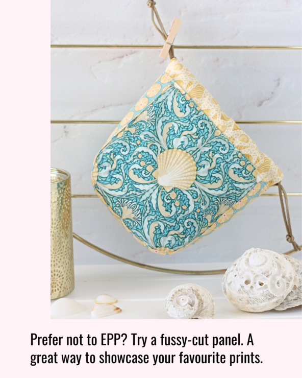 If hand‑sewing isn’t your thing, you can swap the hexie flower for a fussy‑cut feature panel. This is a great way to highlight a favourite print or motif, and it gives the pouch a completely different look.
