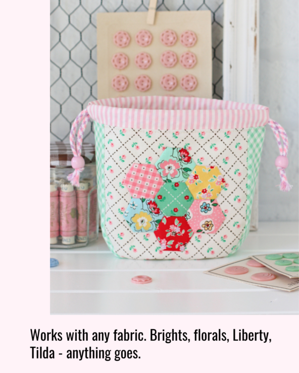 The classic version features a sweet hexie flower on the front panel — a wonderful introduction to English Paper Piecing. It’s a relaxing hand‑sewing project and a lovely way to showcase tiny prints or favourite scraps.