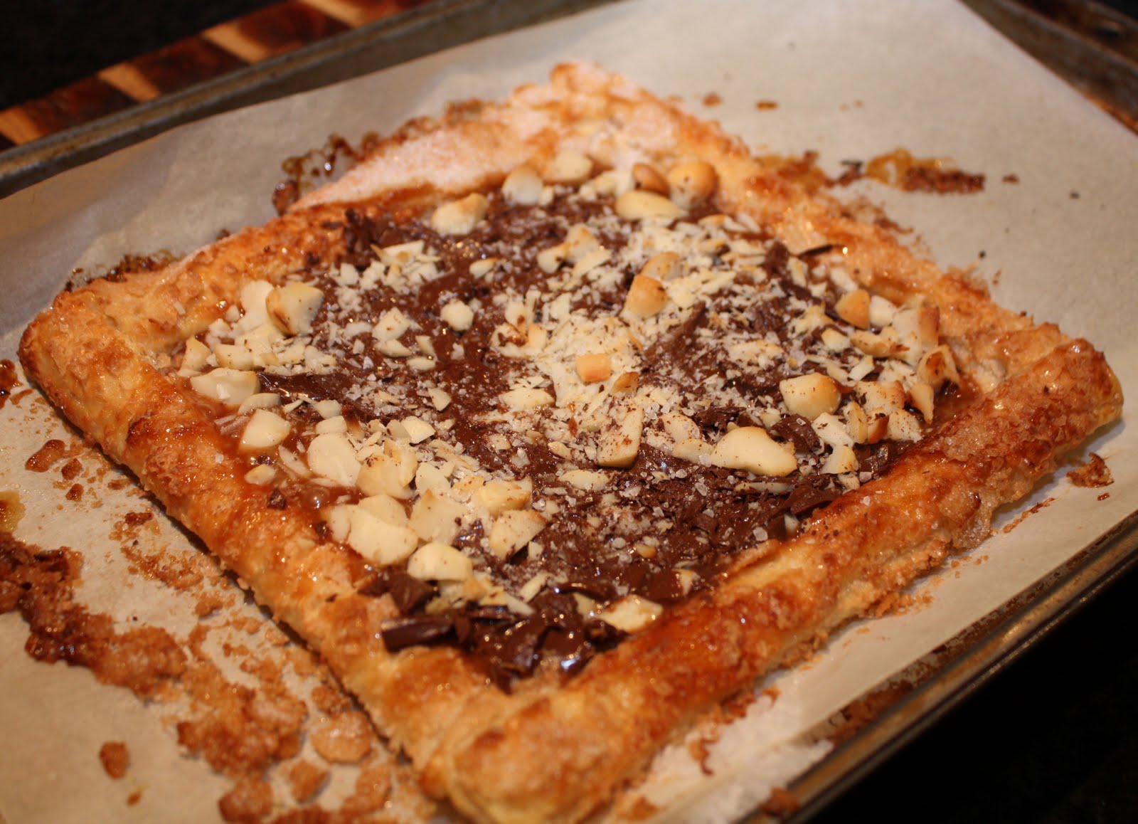Bake until pastry is golden brown about 15-20 minutes. Press the middle of the shell down, leaving the outside border puffy. Cover centre evenly with a layer of caramel sauce. Cover with chopped chocolate and a sprinkling of sea salt. Return to the oven until the chocolate melts.(approx 2 minutes). Sprinkle with macadamia’s and cut into 4 squares. Delicious with vanilla ice-cream.