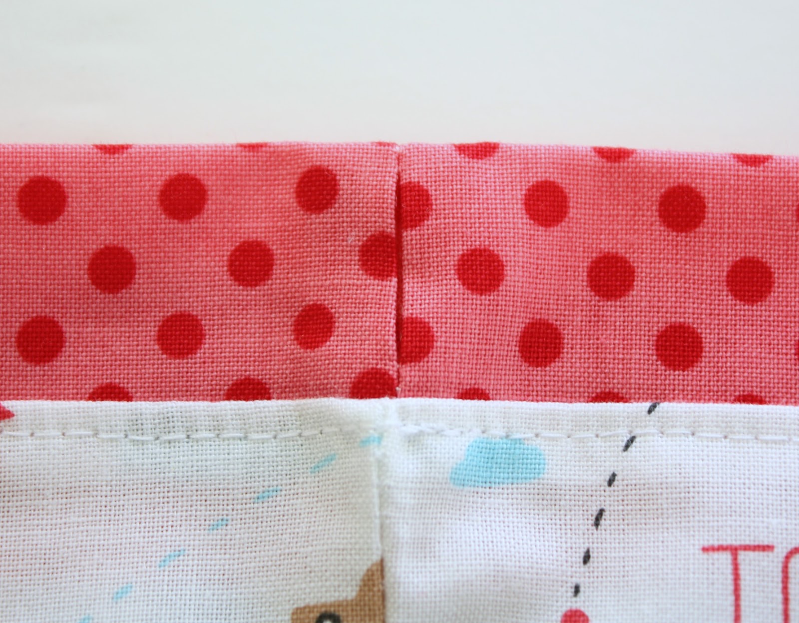 3. Press the seams on the polka dot fabric open. Fold the fabric in half lengthwise and press. Pin the raw edges of the polka dot fabric to the opening of the bag, with the seams aligned. Stitch in place around the opening of the bag. Overlock the edges. Press. Topstitch around the opening of the bag as shown in the photo.