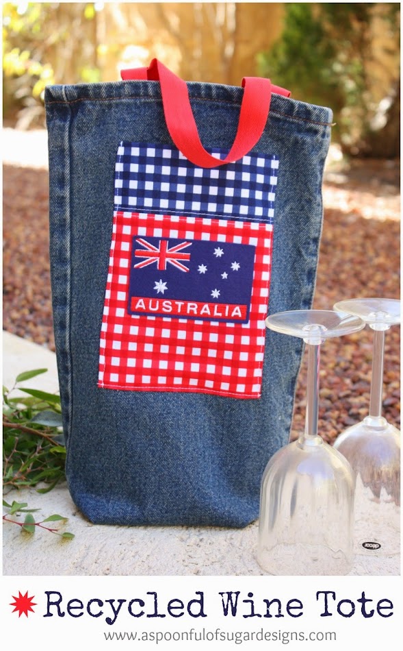 We have made a wine tote using a recycled leg from an old pair of denim jeans to take to our Australia Day picnic. This is a quick upcycle project that involves adding a bright pocket, an Aussie flag, and some handles to a denim jean leg. Cheap and practical – it is sure to add some good ol’ Australian spirit to your Australian Day event.