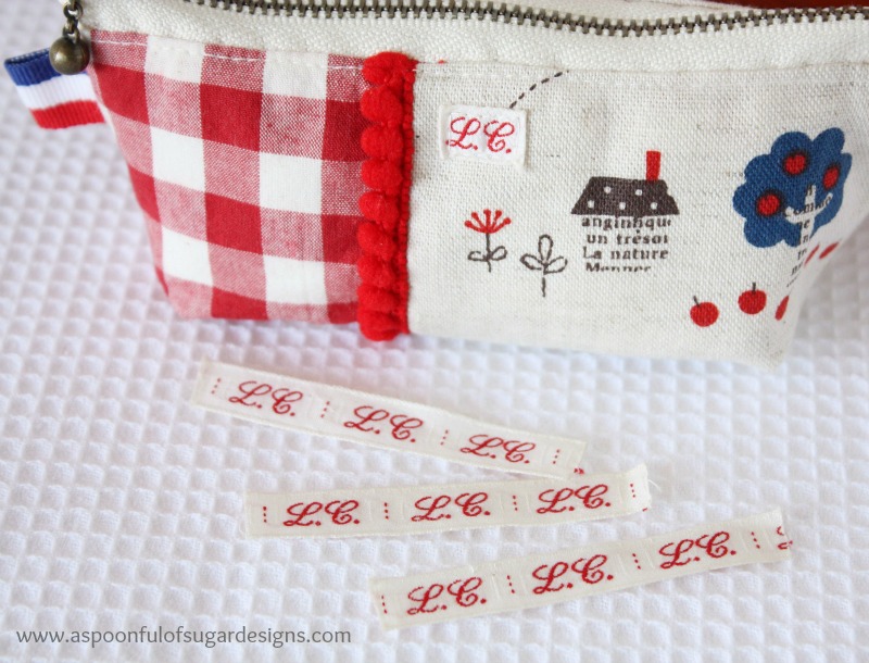 The pouch is sized at 4 inches in width (along the base), 2 1/2 inches high, and 6 inch zip.It is made from a linen print fabric and gingham, with pompom trim.