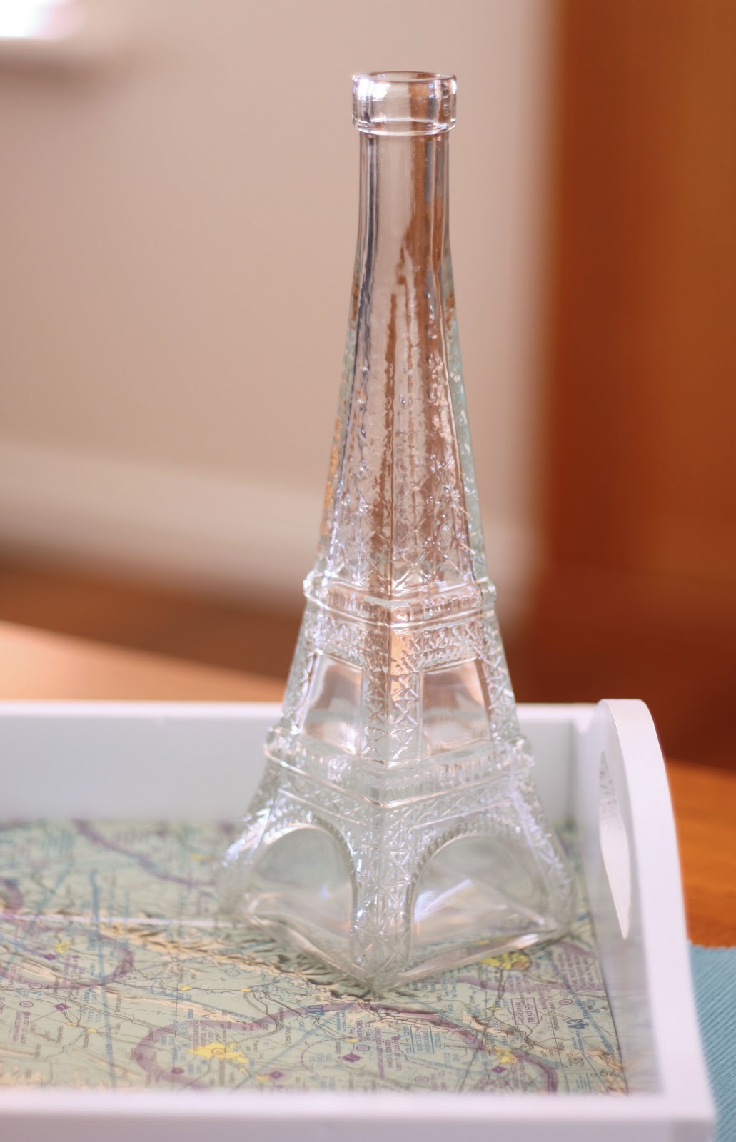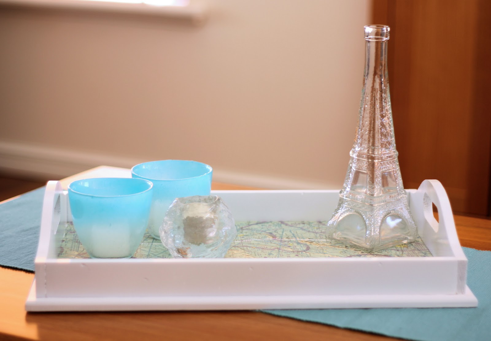 This is a great way to liven up an old item, and coordinate with you new theme. I love the crisp whiteness of the tray. I love maps and travel themes so the map is a perfect addition. Fun to update your decor with simple projects like this, isn’t it.