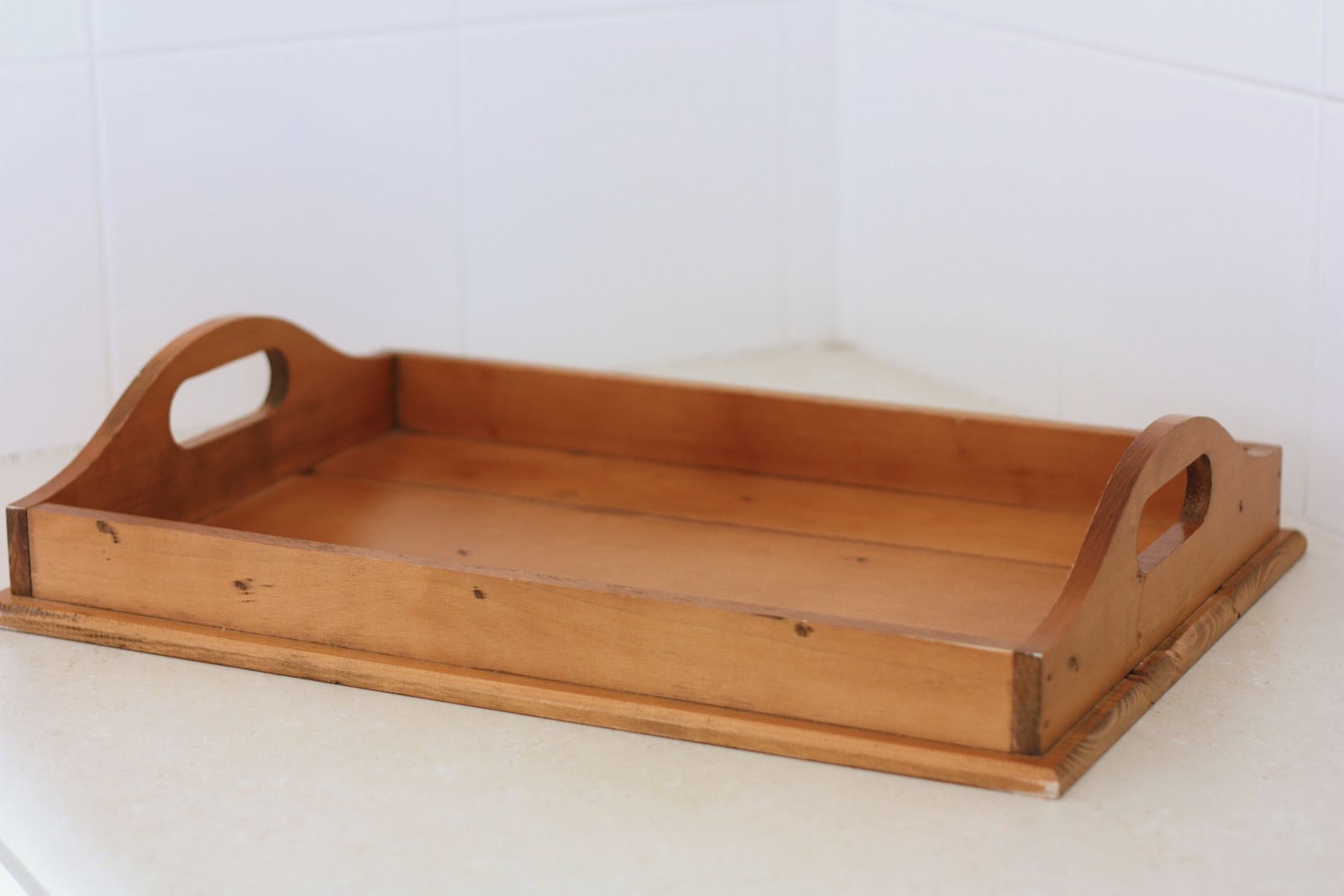 I had an old pine wooden tray, purchased for a previous home that had a country cottage kitchen.