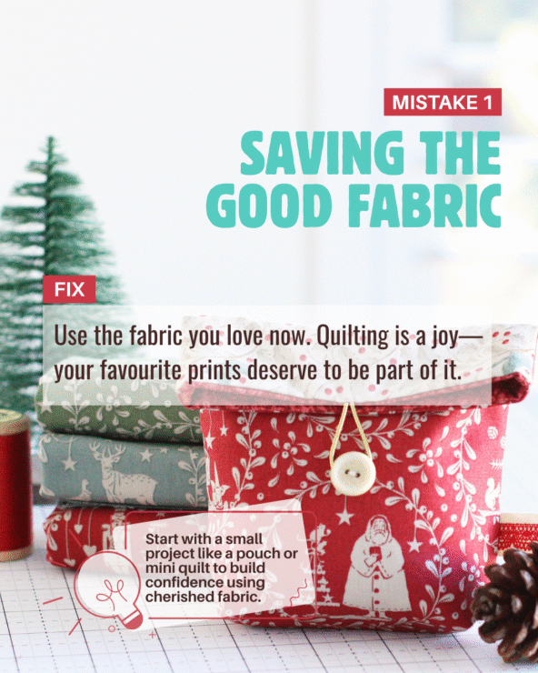 Fix: Use the fabric you love right now. Tip: Start with a small beginner-friendly pattern—like a mini pouch or scrap-friendly quilt block—to build confidence and showcase those prints.