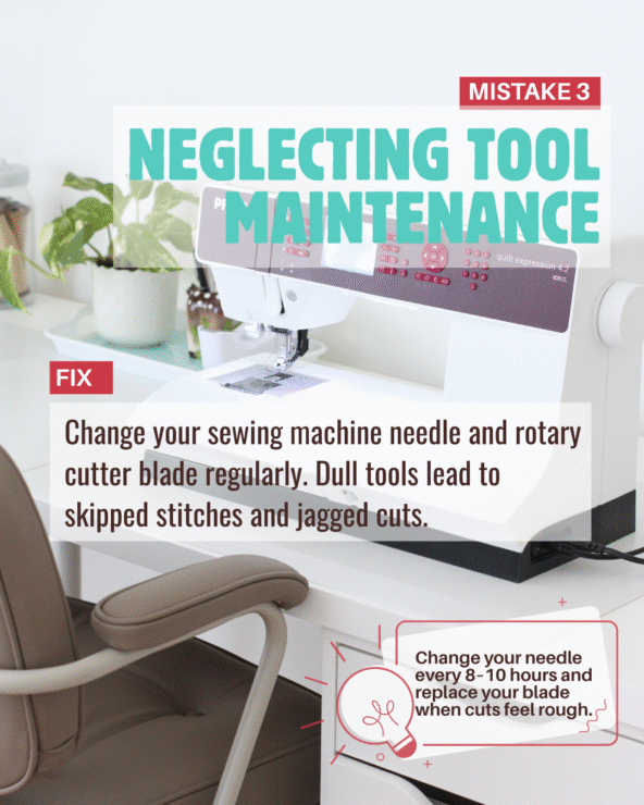 Fix: Replace your sewing machine needle every 8–10 hours of sewing, and change your rotary cutter blade as soon as cutting feels rough. Tip: Keep a small pouch of fresh needles and blades next to your machine so you never lose momentum hunting for replacements.