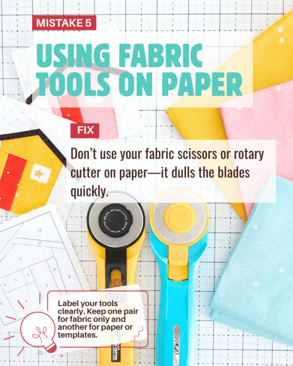 Fix: Label and designate one pair of scissors and one rotary cutter blade for fabric only, and another set for paper or templates. Tip: Use washi tape or a permanent marker to clearly mark “FABRIC ONLY” on handles.