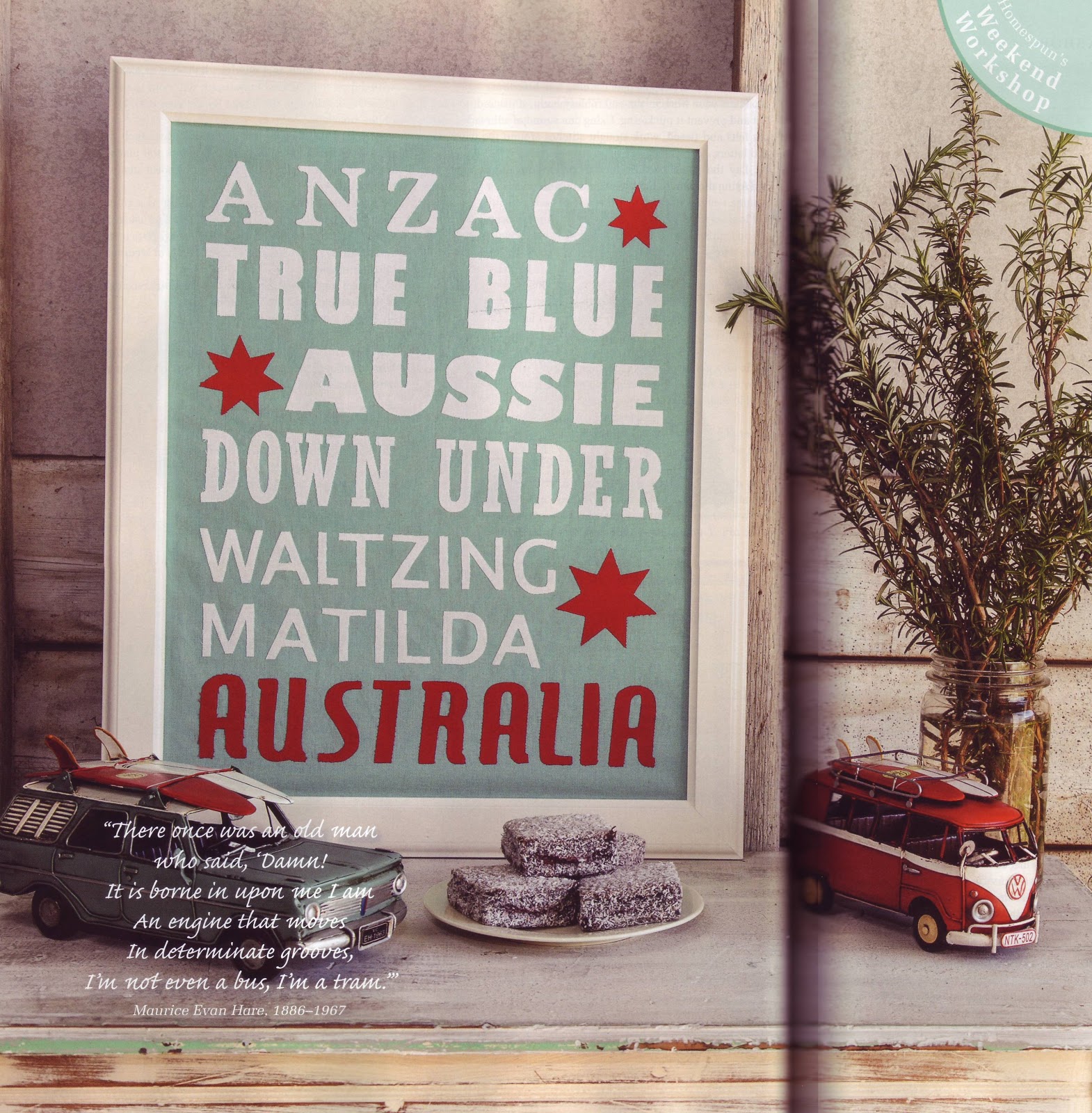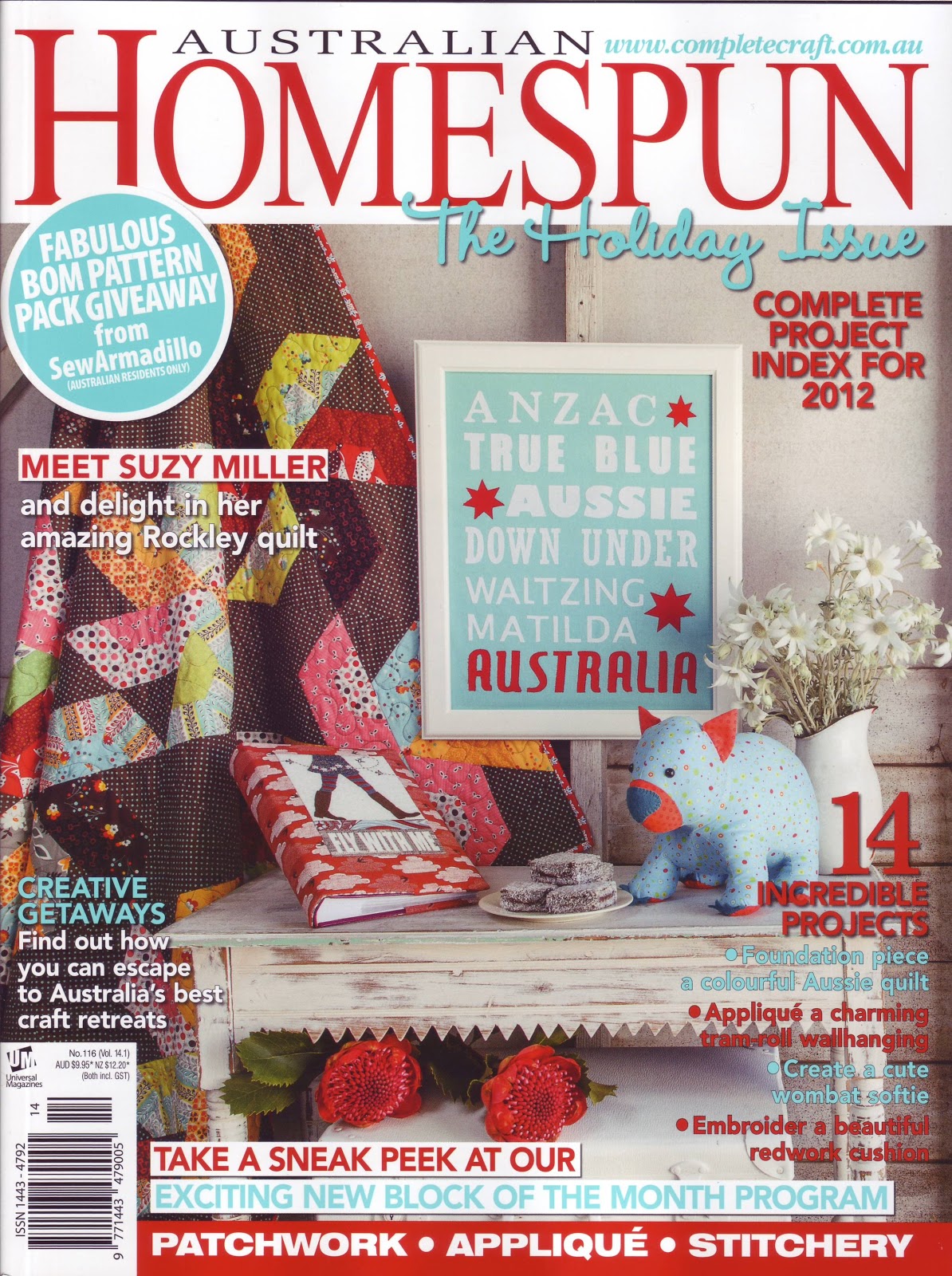 When I was dropping the teens to work tonight, I dropped into the newsagency and picked up the latest issue of Homespun – The Holiday Issue. This issue has lots of lovely summer projects, many with an Australiana theme. It includes my True Blue Subway Style appliqued wall art. It also includes some great projects from some of our favourite Aussie designers/bloggers – Kate Henderson, Ros Mirrington, Rachel Measham-Pywell, Kristin Paton, and more.