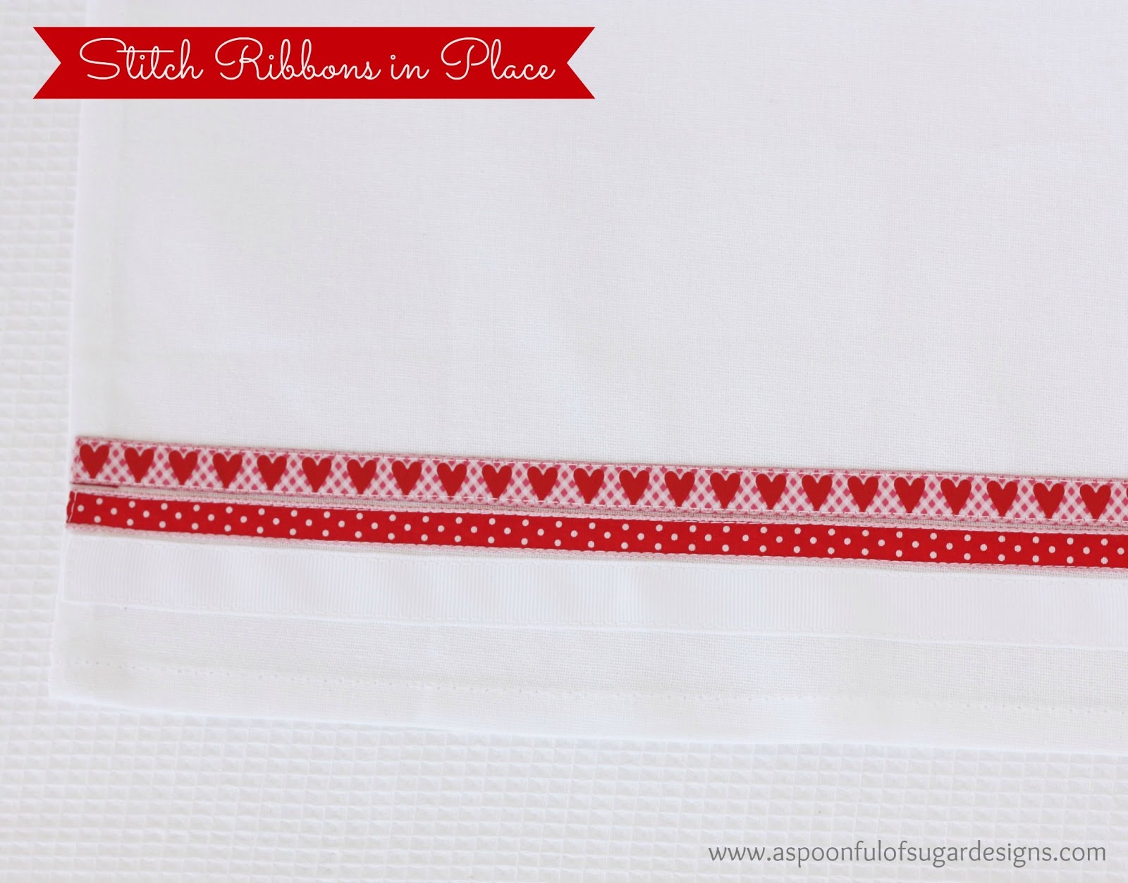 I cut the ribbons so that they were the 1 inch longer than the width of the napkin. The ribbons were pinned 1/2 inch from the bottom edge of the napkin and stitched in place, approximately 1/8 inch apart. At each end, 1/2 inch of ribbon was tucked under.