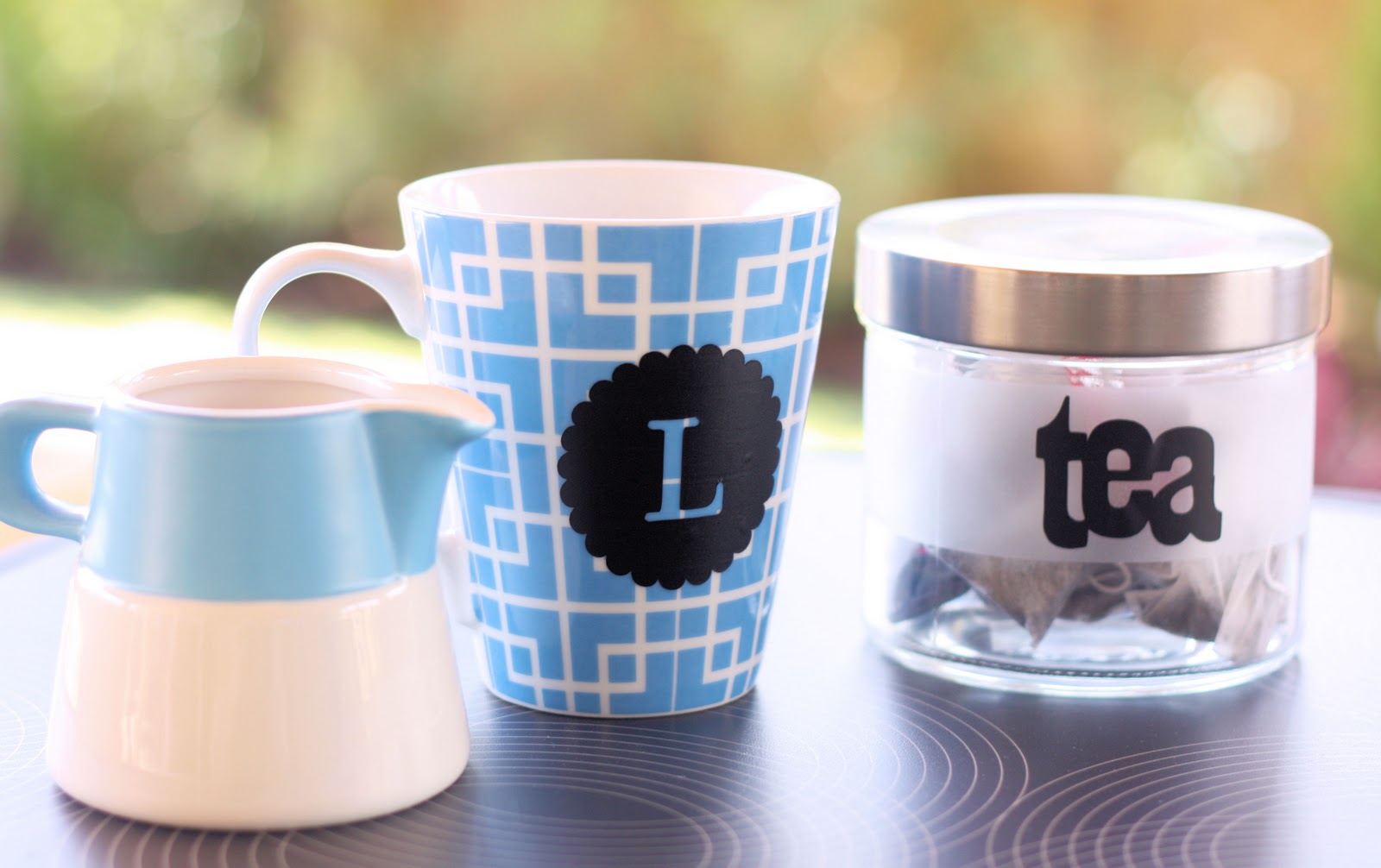 My word for 2012 is Update – i.e. modernize and refresh. I want to update my eating and exercise habits, update our home, and update my goals. With this in mind, I wanted to organise a few things to update my workstation at the day job to make it more personalised. We have to supply our own tea/coffee, so some vinyl lettering was in order.