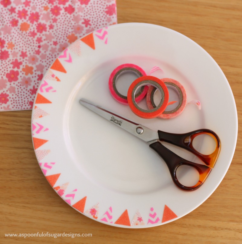 Most of our china and tableware is plain white. I love the simplicity and timeless appeal of white china and it really showcases the food, but it can be rather boring. I recently spotted some lovely ceramics on Pinterest that had been painted with a bunting design. That got me to thinking that washi tape would be the perfect way to add some temporary colour to plain tableware for a party or special occasion. It can easily be peeled off when you are tired of the design.