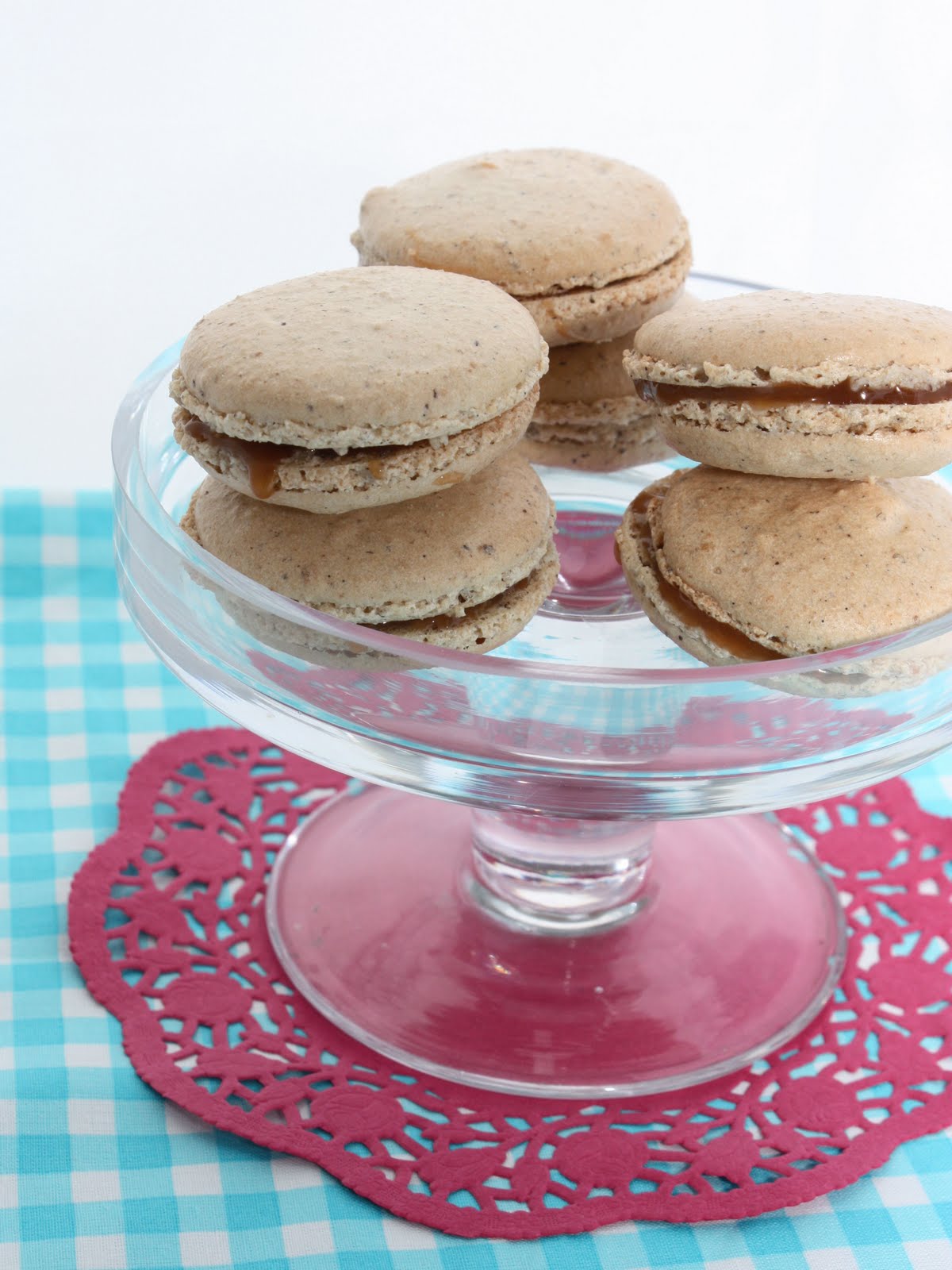 Sarah used the basic macaron recipe from Cake Journal which has helpful step by step photos and tips. She flavoured the basic mixture with 3/4 teaspoon of vanilla bean paste to give it a vanilla flavour.