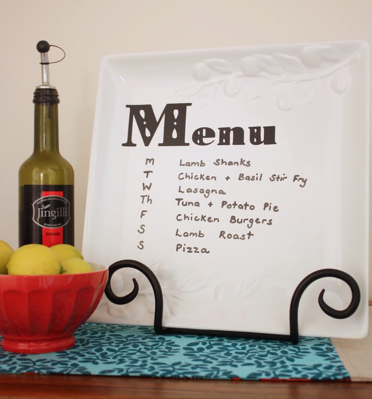 One of the really cool projects that I spotted this week was the tutorial for a Dry Erase Menu Plate over at Little Birdie Secrets. I would never have thought of using a dry erase marker on a plate! A most inspired idea. Of course I had to make one right away 🙂