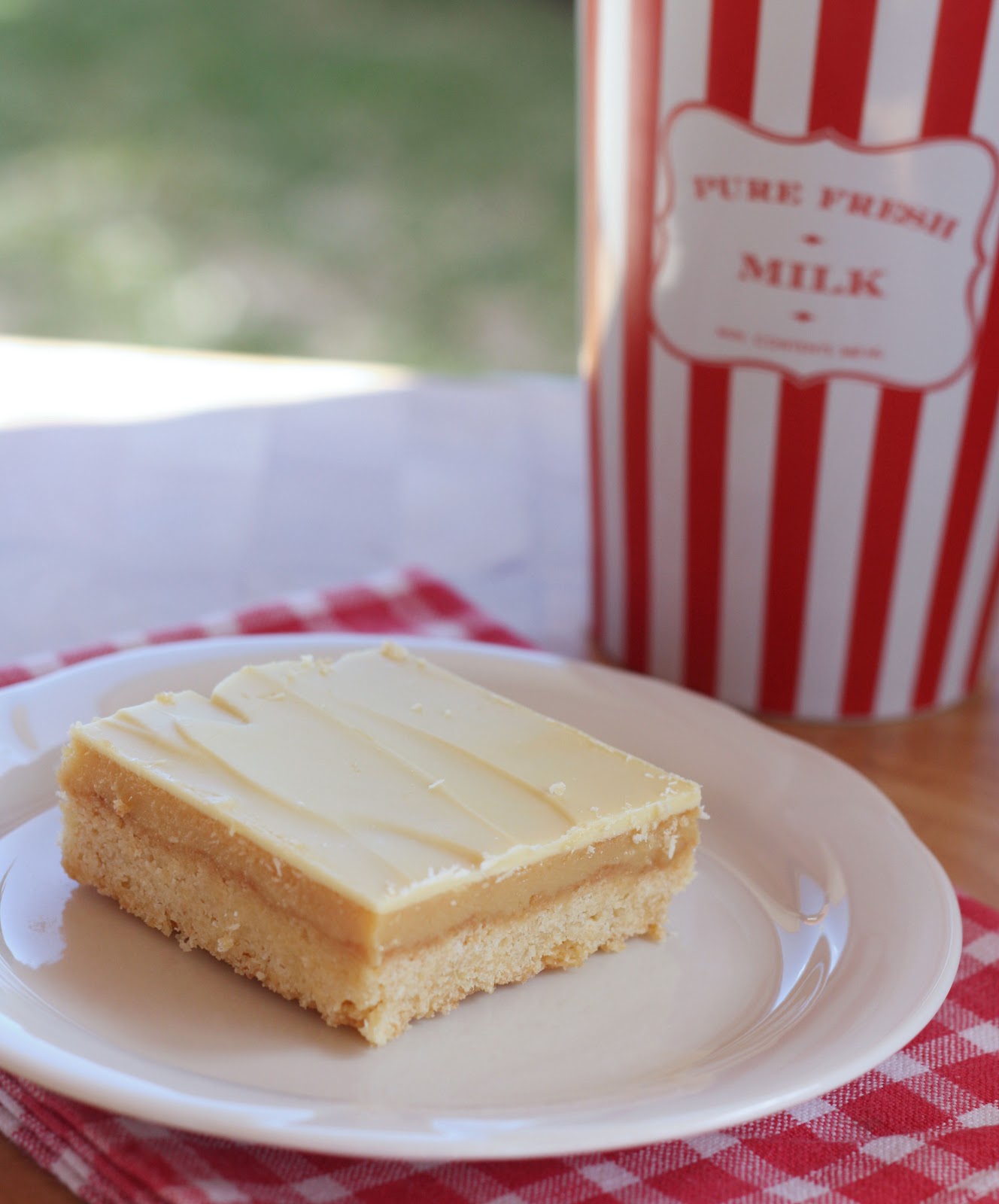 Every year, Sarah asks her brother what treat he would like her to bake for his birthday. Every year he asks for Chocolate Caramel Slice. This year was no different and Chocolate Caramel Slice was requested again. Sarah discovered we were out of chocolate in the pantry so used white chocolate instead. It was a real winner! What I love most about this recipe, is that the ratio of Coconut Shortbread Base to caramel filling is just perfect!